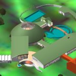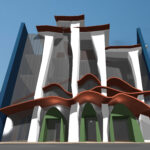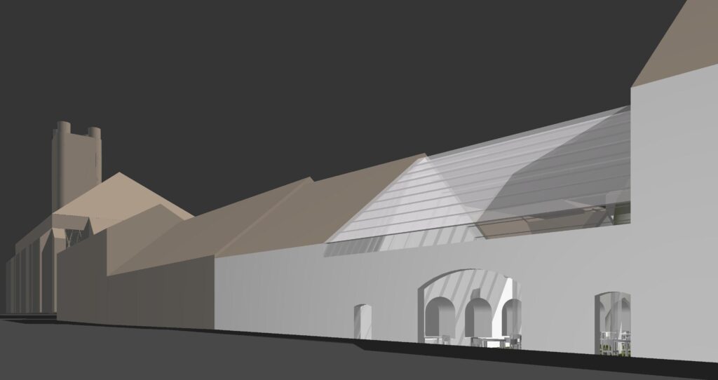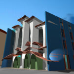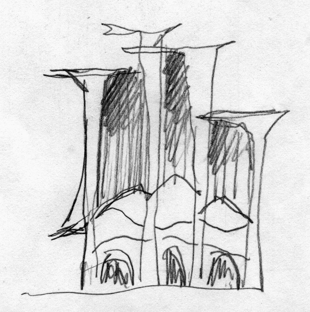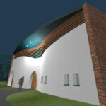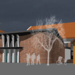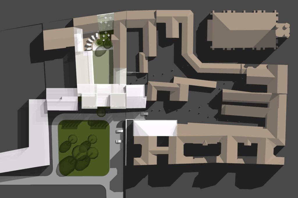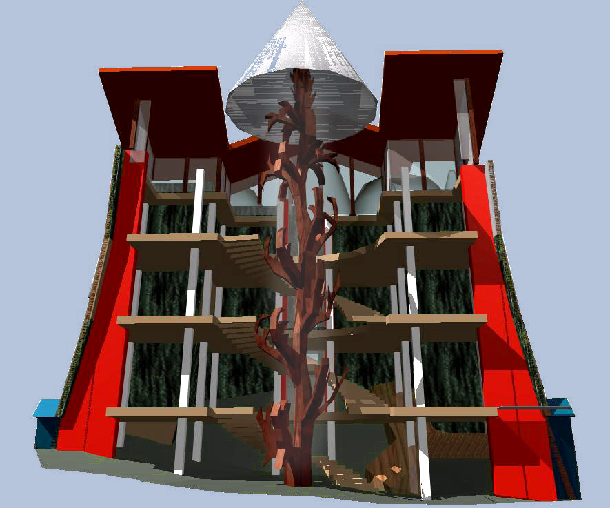 Egy tervpályázatra készült elképzelésem, amely nem nyert díjat, csak megvételt. Sajnos nagyobb lett a kelleténél. A külső kemény, mint a környező épületek. Sőt, még határozottabb. Nagyon „technós”, csak a kapu fölötti góré motívum sejtet valamit. A nagy falak közé szorított vidék. Kisvárosi, vagy inkább kis falusi mintát követ az épületegyüttes. A főépület itt nem a szokásos templom, hanem a nagy előadó, a tudomány szentélye.