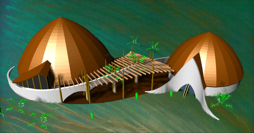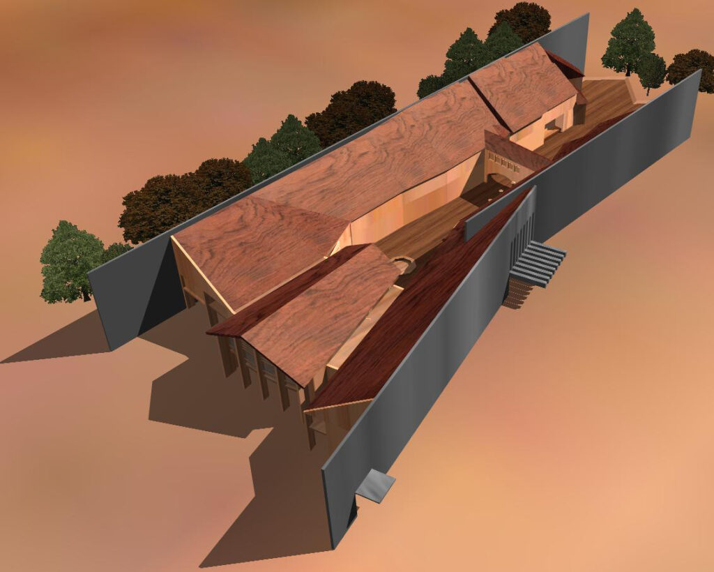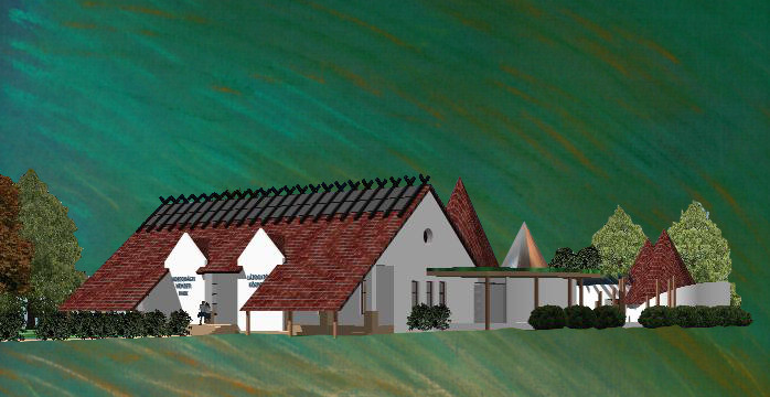 A sors (először politikát írtam, de módosítottam sorsra) kifürkészhetetlen útjai lehetőséget adtak nekem több hortobágyi épület tervezésére, a felépült templomon kívül is. A vadaspark malomházi állatbemutatói többé-kevésbé fel is épültek a túzok, a farkasok, a vadlovak számára. Készítettünk tervet a ma is álló körszín épület átalakítására és bővítésére, közúti hidakra, majd a látogatóközpont meghívásos pályázatára. A sors (?) azonban máshogy döntött. A hivatalába visszaköltöző régi-új igazgató érvénytelenítette a pályázatot, s távoli vidékről hívott tervezőt a megvalósításhoz. Így itt, most csak az elképzeléseimet mutathatom meg, amelyek a pusztai pásztorépítmények világát idézik fel.