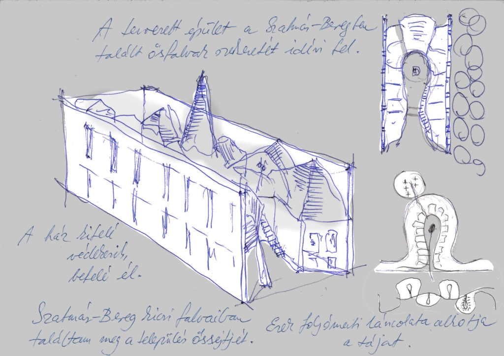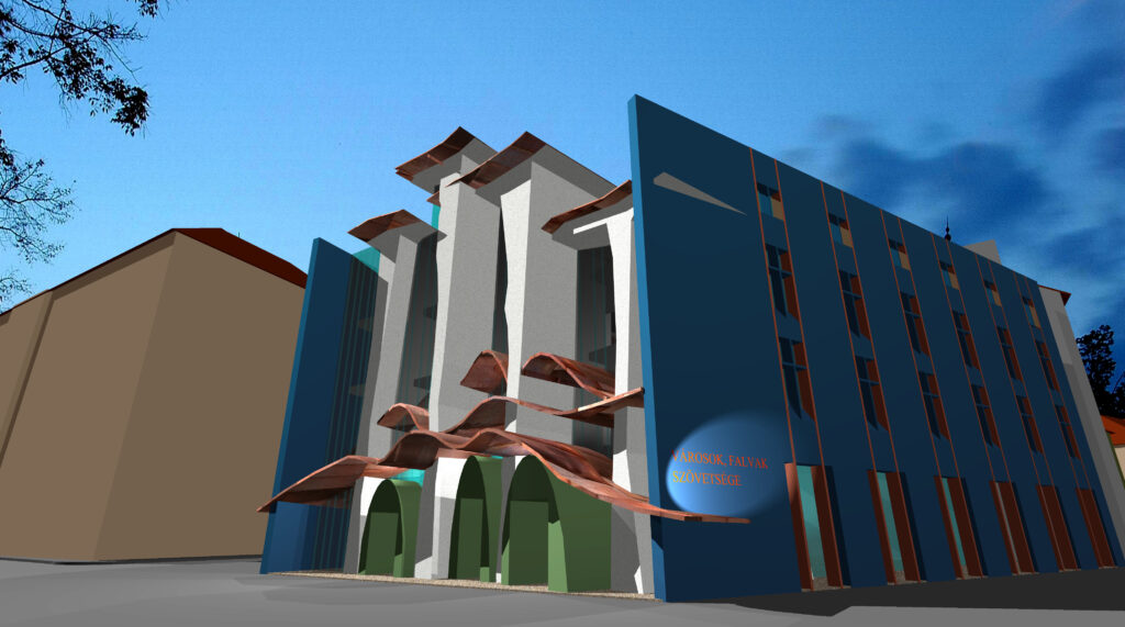Az első „Európa kulturális fővárosa” címre készített debreceni pályázat hat tervünket tartalmazta, ebből kettő „kulcsprojekt” volt (jujj), amit mindenképpen meg akart építeni a város. Ez volt az egyik, a másik a Ludas Matyi park, vagyis az állatkert. Nagyon tetszett ez a feladat, mert a célja igazán tartalmasnak tűnt: a református kollégium filiáinak újraélesztése, vagyis a közeli s távoli vidékeken létesített egykori tagiskolák nyomán a régi kapcsolatok felelevenítése, kulturális csere érdekében. Nemcsak épület nincs, a szövetség is csak szárnyaszegetten működik.