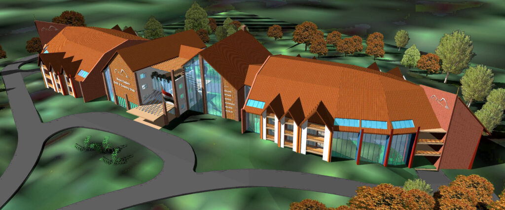 Meglepő, de Debrecen közelében található hazánk legjobb, 18-lyukú golfpályája, ahol az elmúlt években még nemzetközi versenyeket is rendeztek. Bécsben tervezték, skót szakember simogatta ki a terep hullámzását. A gyönyörű létesítmény magánerőből készült, hatalmas munkával, azzal a szándékkal, hogy ezt a sportot meghonosítsa errefelé. Ennek déli részére került volna a golf klub és szálloda épülete 77 szobával, melynek az engedélyezési tervét készítettük el. Elhelyezését alapvetően a golfpályák terve határozta meg: a terület bejáratánál a tanulópálya található, ezt követi a szálloda egy domb tetején, amelynek túloldali kijáratánál indul az első versenypálya. Innen belátható a 18-pályás terület nagy része. Az épületre két tanulmányterv készült, egy sportos vonalú és egy hagyományosabb, a népi építészethez közelebb álló változat. Ez utóbbi készült volna el. Támogatókra azonban nem talált sem a városnál sem országosan, sem sport, sem idegenforgalmi vonalon. A honosodás elmaradt, a szálloda nem épült fel, a terület eladó.