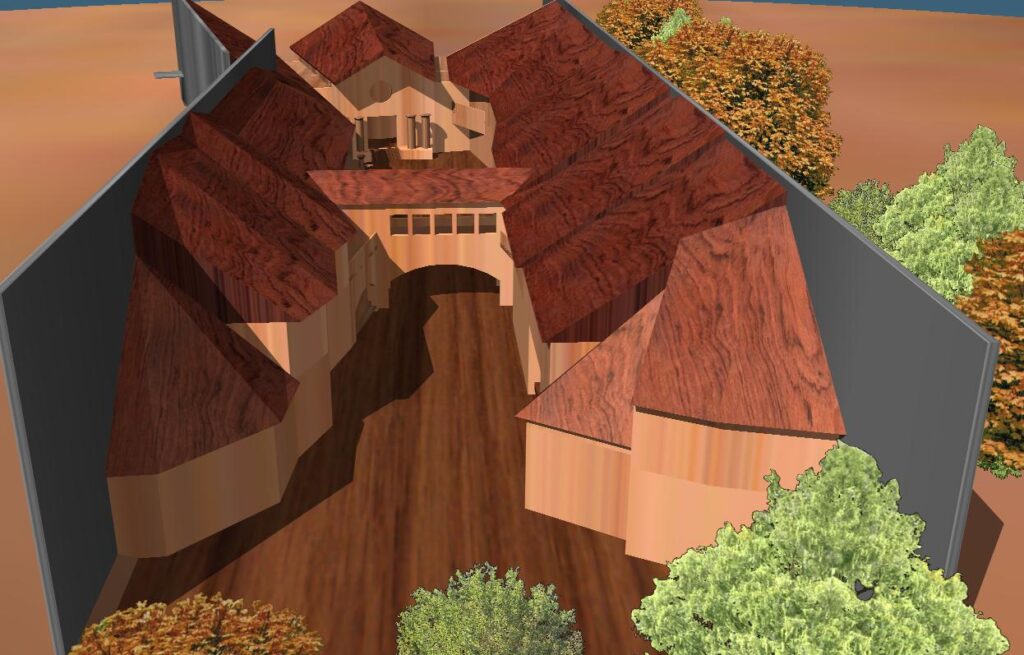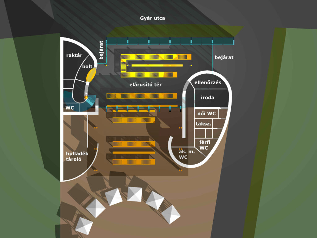 Tulajdonképpen egy kis üdülőtelep terve a gyönyörű Gúti erdőben, ahol még áll a Zsuzsi vonat egykori állomásépülete. Ennek felhasználásával alakítottuk ki az épületegyüttest, ahol minden lakóegységnek saját udvara, kertje lenne. Ez volt az első tervünk.