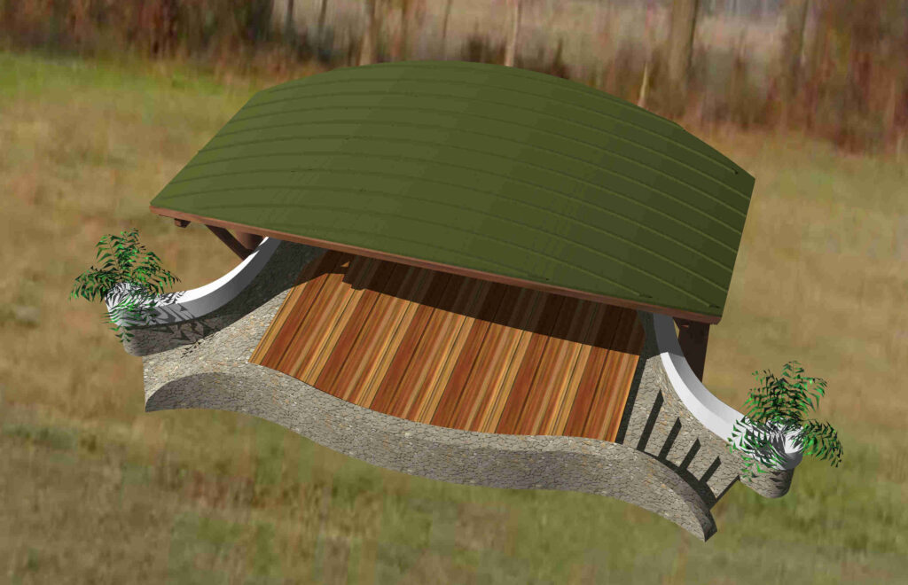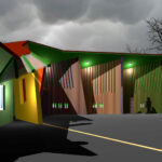 Lehet találgatni, hogy melyik együttesé. Családi házas övezetben épült volna, ezért rendkívül erős hangszigeteléssel terveztük. A kemény rockot sejtető külső mögött raktár, próbaterem és pihenő kapott volna helyet, ha sikerül pályázati támogatást nyerni. De nem sikerült.